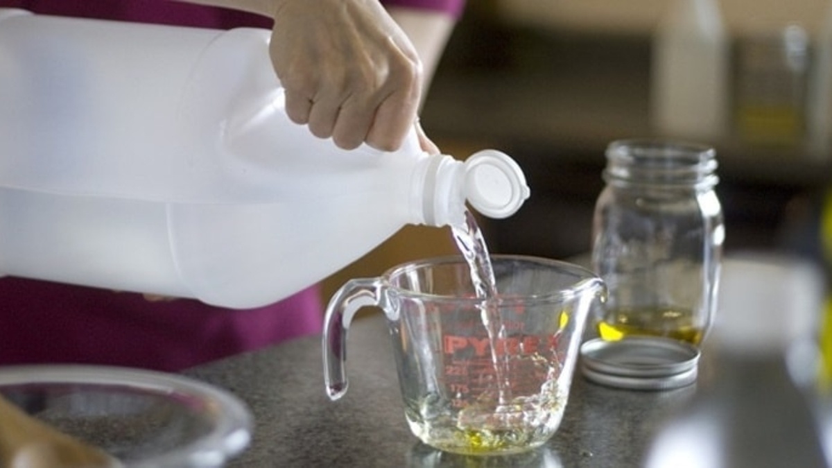 - Đổ giấm trắng vào bình (khoảng 1/2 đến đầy bình tùy thuộc vào độ bẩn).