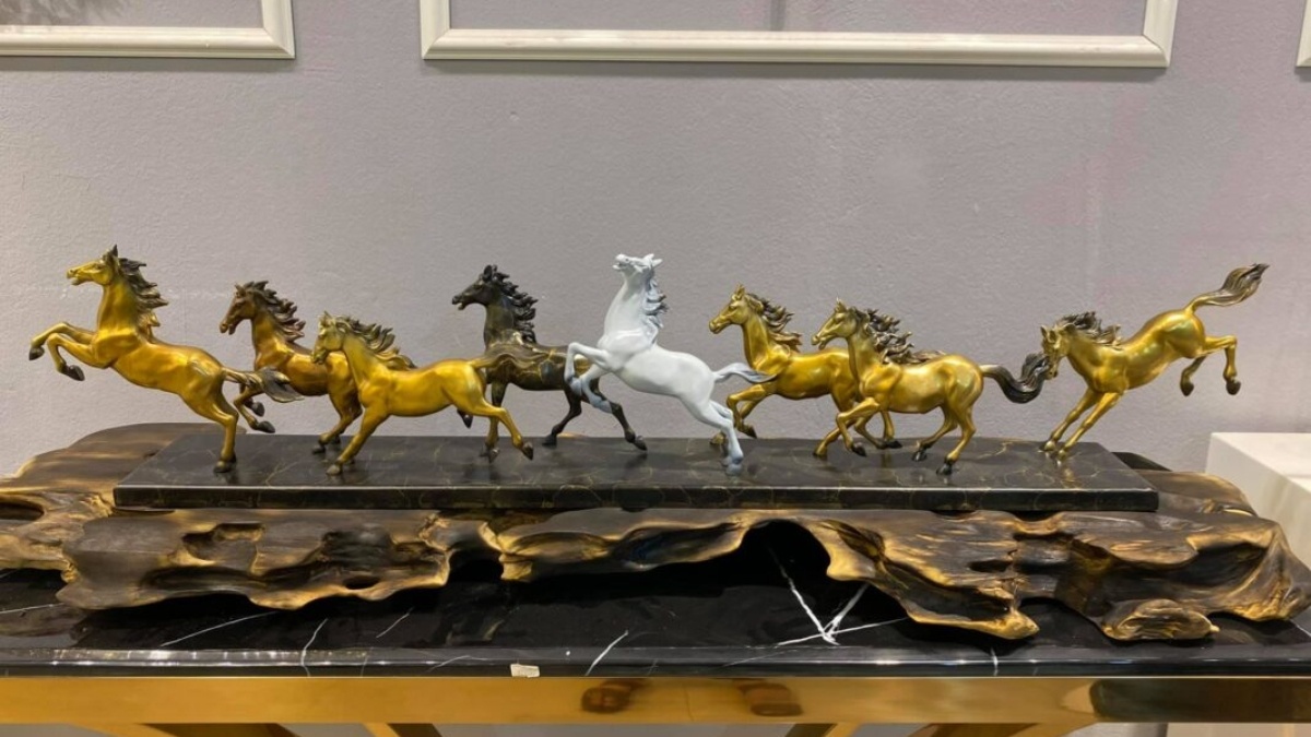 - Bát Mã: Đây là số lượng được ưa chuộng nhất, gắn liền với biểu tượng "Mã Đáo Thành Công". Trong tiếng Hán, số 8 đọc là "Bát", đồng âm với từ "Phát" (phát đạt, phát tài). Hình ảnh 8 con ngựa cùng phi về một hướng đại diện cho sự đồng lòng, thịnh vượng và thành công rực rỡ. Bát Mã thường được mua làm quà tân gia, khai trương chúc gia chủ làm ăn phát đạt.