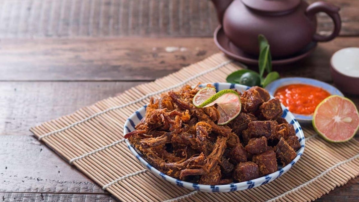 Không khô cứng như dê khô thông thường, món này được làm từ thịt đùi dê núi Ninh Bình tươi ngon nhất, thái mỏng, ướp gia vị bí truyền rồi sấy tái một nắng, cuối cùng rim cháy cạnh cháy tỏi phi vàng óng. Thành phẩm là từng miếng thịt vàng ruộm, giòn rụm bên ngoài, vẫn mềm ngọt bên trong, thơm nức mùi tỏi cháy và lá chanh rừng Cúc Phương – cắn một miếng là cay cay, ngọt ngọt, thơm lừng lan khắp miệng.